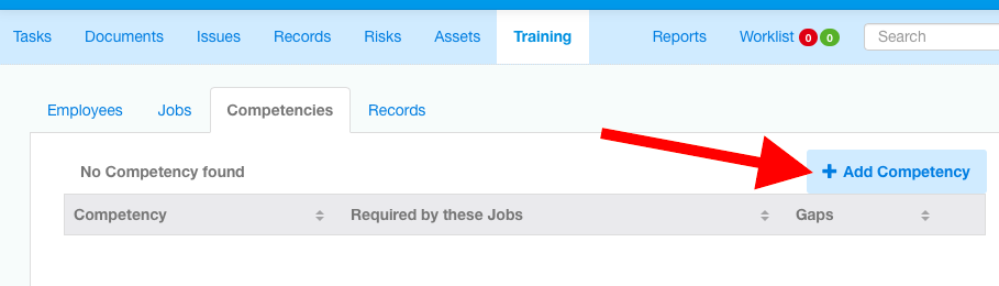 Under the Training module (light blue toolbar), open the Competencies tab and click on '+ Add Competency'.